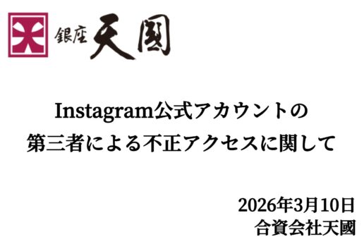 平素は格別のご愛顧を賜り、厚く御礼申し上げます。 この度、2026年3月9日(月)に、弊社が運営するInstagramの「銀座 天國」公式アカウント(ginza_tenkuni)において、第三者による不正アクセス(アカ...
