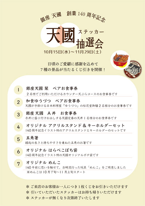 私ども銀座 天國は、2025年10月に創業140周年を迎えました。
